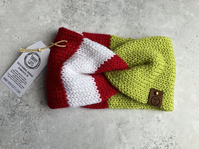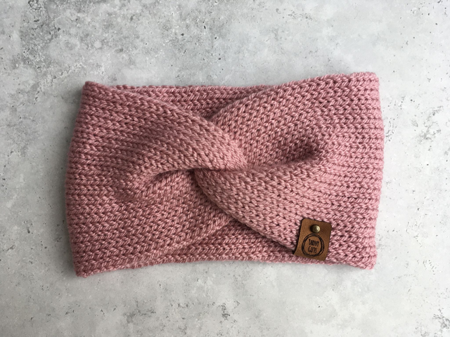 Gorgeous, cosy, knitted twist ear warmer headband. Knit from hardwearing premium acrylic yarn and finished with a stylish faux leather label (so it's vegan friendly too).