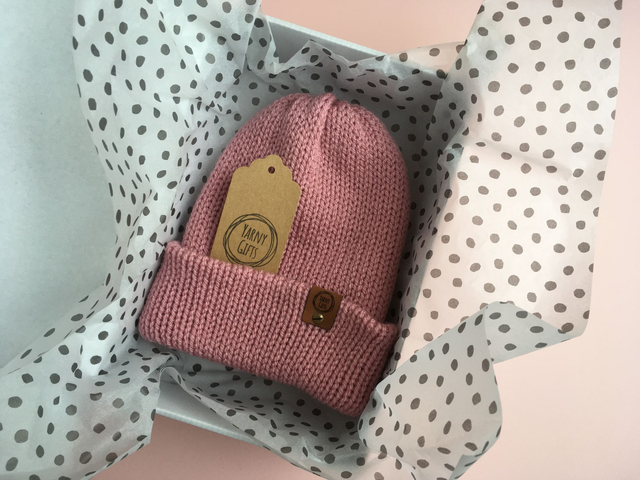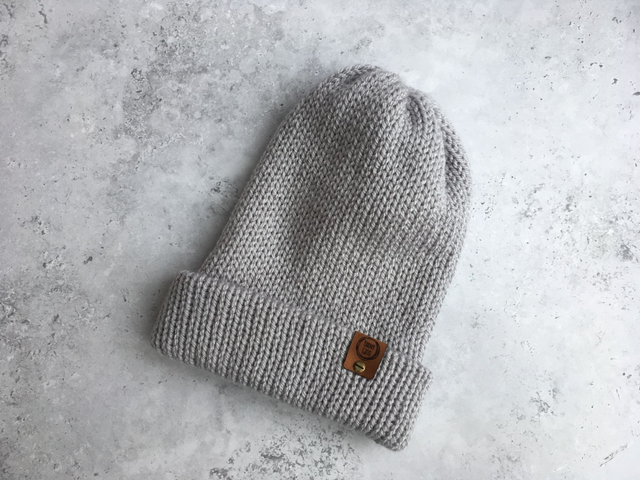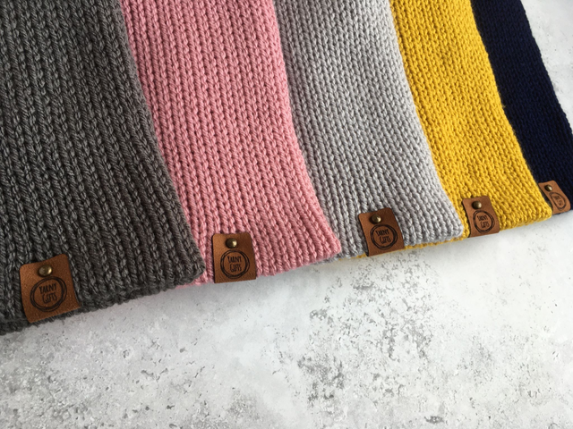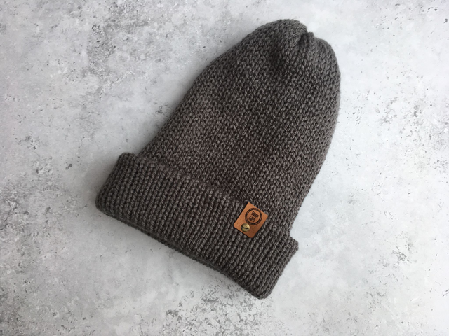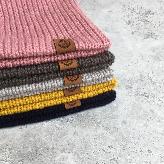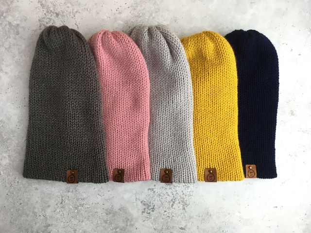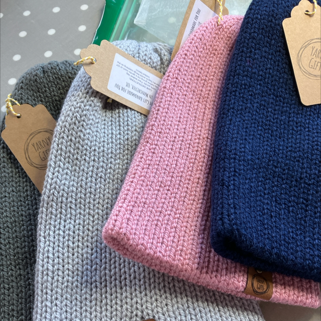 Cosy, knitted hat. Knit from hardwearing premium acrylic yarn and finished with a stylish faux leather label (so it's vegan friendly too). The hat can be worn folded, with a brim, or slouchy style.